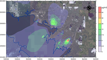 A continuación se presentan los principales resultados obtenidos de la modelación de la dispersión de contaminantes en la zona de la ciudad de Cienfuegos, teniendo en cuenta las emisiones de las principales fuentes fijas en el año 2014.
