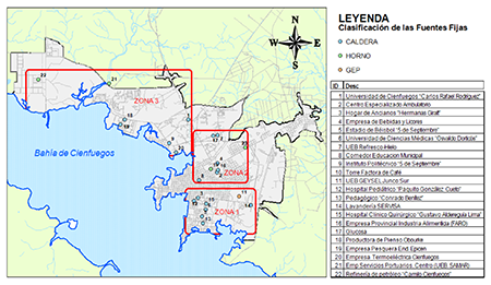 La distribución espacial de las fuentes mostró la presencia de tres zonas dentro de la ciudad tal y como describen Cruz et al. (2014). La primera está ubicada hacia el sur donde se agrupan la mayor cantidad de fuentes relacionadas con el sector de la salud (Hospital Clínico-Quirúrgico, Universidad de Ciencias Médicas, Hospital Pediátrico y Hogar de Ancianos), así como otras entidades como el Instituto Superior Pedagógico, Estadio de béisbol y la lavandería de Servisa. En esta zona también se encuentra el GEP descrito anteriormente.