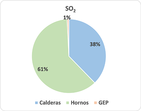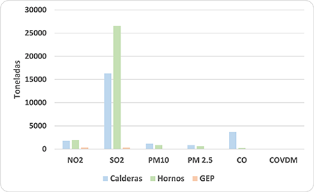 El 99 % de las emisiones del SO2 provinieron de las calderas y hornos dentro de ellos la Termoeléctrica y la Refinería son las que emitieron la mayor parte con más de 42 mil toneladas al año, Figura 5. Las refinerías y termoeléctricas son industrias consideradas como las más contaminantes a la atmósfera en el país, (Cuesta et al., 2017). Estas fuentes producen grandes emisiones por el alto contenido de azufre en el combustible utilizado.