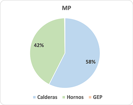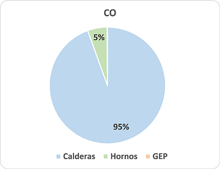 Las mayores emisiones de CO y material particulado pertenecieron a las calderas con el 95 % y 58 % respectivamente, Figuras 7 y 8.