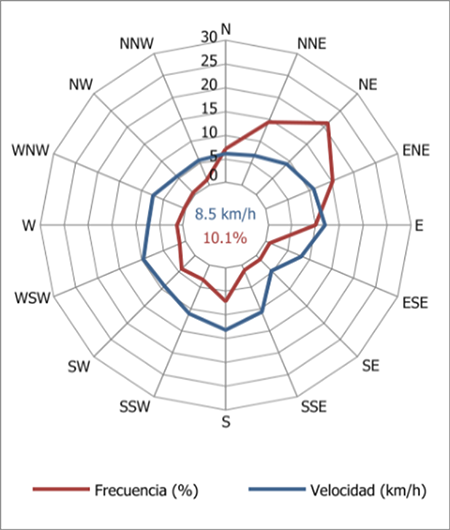 La velocidad media anual fue de 8.5 km/h. Las mayores velocidades del viento se alcanzaron con rumbos de región sur alcanzando más de 12 km/h como media. El comportamiento mensual indica que los meses de marzo y abril presentaron los mayores valores.
