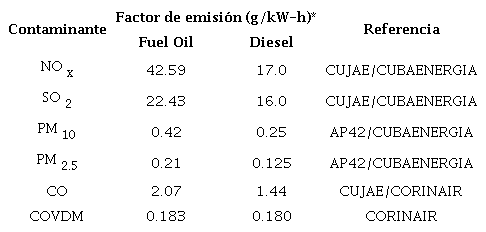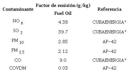 En el caso de la generación eléctrica en termoeléctricas se utilizaron los valores determinados de FE propios de CO, NOx y SO2 para el fuel-oil que es el combustible empleado en la generación eléctrica en la Carlos Manuel de Céspedes, que se reportaron para ser utilizados en la realización de los Inventarios de Gases de Efecto Invernadero procedentes de la generación de electricidad, estudios de mitigación y determinación de líneas bases, Meneses et al., 2018.