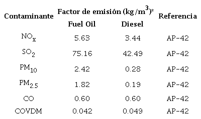 Los factores de emisión utilizados en este resultado se obtuvieron a través de las fuentes siguientes: Compilación de factores de emisión de contaminantes atmosféricos (Emission Factor and Inventory Group) AP-42 (U.S. EPA, 1995a) y del software Industrial Pollution Control (Control de Contaminación Industrial) (IPC, 1995) desarrollado por el Banco Mundial, la Organización Mundial de la Salud (OMS) y la Organización Panamericana de la Salud (OPS).