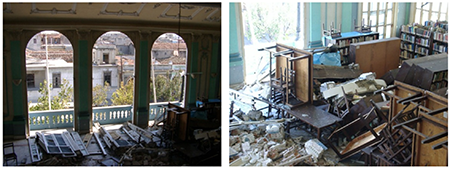 La Biblioteca Provincial “Roberto García Valdés”, otrora Liceo de Cienfuegos, institución diseñada por el arquitecto italiano Alfredo Colli en 1921 expresamente para dicha sociedad de instrucción y recreo, edificación de dos niveles ubicada en la intersección de las arterias: calle 37 y Avenida 58 (Prado y Santa Cruz) sufrió el azote de este organismo tropical, provocando daños considerables en su estructura, cubierta y ventanas originales dado el influjo de los vientos huracanados llegados por ambas arterias, Figura 1.