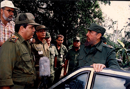Una foto muy estimulante en el joven meteorólogo, constituyó la tomada en las áreas de dicha instalación militar, Figura 5. En la misma se ve un Fidel impresionado, por los desastres ocurridos, la confianza en la recuperación, pero más aun por la presencia de un equipo provincial ya fraguado en estas contiendas naturales, al punto de mantenerse en la puerta de su vehículo por espacio de 45 minutos, escuchando y dando orientaciones. En el fondo de la imagen, un Tony pensativo y confiado, al saber que sus conocimientos hicieron más fáciles la toma de decisiones para enfrentar tan aciago ciclón.