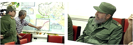 Su estancia fue por espacio de entre 45 minutos y 1 hora y en la misma se le rindió un informe preliminar sobre la magnitud de los daños sufridos, las acciones de recuperación realizadas en el más breve tiempo, más las perspectivas futuras en la mitigación de los mismos. Trasmitió además un reconocimiento a la población, indagó los detalles más mínimos del peligroso huracán y se interesó por las necesidades de recursos. Nuevamente el Dr. Sc. Antonio de J. Fernández García, le informó detalladamente los pormenores del huracán a su paso por la provincia, en un pequeño local escogido a estos efectos. Una mesa grande los separaba, con un mapa de Cuba como telón de fondo, más se mostraba seguro de sus fundamentadas explicaciones, Figura 7.