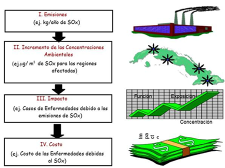 Para evaluar las externalidades de la generación termoeléctrica se aplica la metodología Vías de Impacto, la cual cuenta con cuatro etapas fundamentales, ver figura 1.