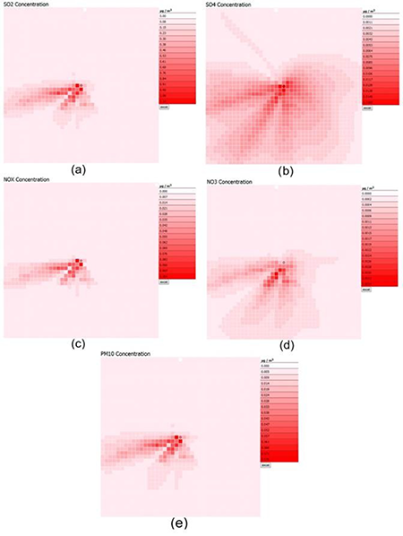 A continuación, se muestran los resultados obtenidos de la modelación de la contaminación para el mismo caso de estudio (Figura 3). Cada figura representa los incrementos de las concentraciones ambientales del contaminante en las diferentes rejillas del dominio.