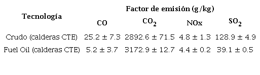 Para estimar las emisiones se empleó el método de factores de emisión (FE), esta vez utilizando factores propios obtenidos a partir de mediciones directas de gases en las centrales termoeléctricas cubanas (Meneses, et al., 2017), y los valores que se toman para el estudio se muestran en la tabla 1. Estos valores incluyen el rango de incertidumbre asociado.