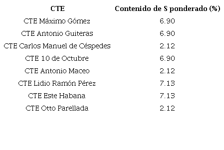 La generación y el consumo de combustible por unidad se obtuvieron de los registros de la Unión Eléctrica (UNE) para el año 2015. Por lo general una misma unidad usó diferentes tipos combustibles, ya sea por diferentes tipos de crudo (1400, 1100 o 650) o de fuel oíl; se calculó una composición ponderada en base al consumo. El contenido de azufre (S) usado para cada CTE aparece en la tabla 3.