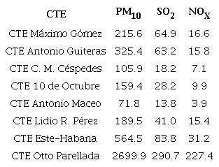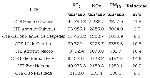 Cada CTE constituye una fuente de emisión. La tabla 2 muestra los datos de localización, altura y diámetros de las chimeneas (chim.); así como la temperatura de salida de los gases. Ante la escasez de datos de mediciones de partículas en CTE, no ha sido posible estimar factores de emisión propios para este contaminante, por lo que se estimaron a partir de los factores de emisión de PM10 filtrables, propuestos por la EPA para emisiones incontroladas en calderas de CTE quemando fuel oíl residual tipo 6 en la AP-42, Sección 1.3 - (Fuel Oil Combustion, Final Section, Supplement E) (EPA, 2010).