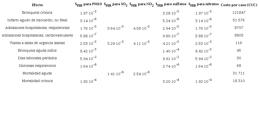 La tabla 5 muestra un resumen de los valores propuestos para la evaluación de los impactos y costos basados en las metodologías empleadas por (Meneses et al., 2008 a, b) y actualizados con datos de 2015. La mortalidad, a diferencia de la morbilidad se expresa el Años de Vida Perdidos (AVP).