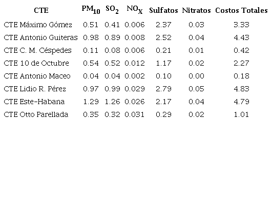 De forma general los mayores costos se le atribuyen a los sulfatos, resultando sus aportes cerca de 60 % de los costos totales por planta, exceptuando la CTE Otto Parellada donde el aporte de las partículas tiene el primer lugar por importancia; cabe señalar que esta Central se encuentra ubicada en el centro de la ciudad de La Habana donde la densidad local de la población es elevada y por tanto aumenta el aporte de los contaminantes primarios como las PM10 y los SO2. Para el resto de las plantas continuaron en orden de importancia los aportes de las partículas nitratos, SO2 y NOX.