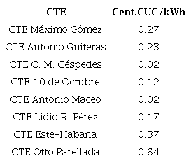 A partir de los costos totales se calcularon los costos específicos en centavos de dólar por kWh generado en las plantas. Los valores estimados de estos costos oscilaron entre 0.02-0.64 centavos de CUC/kWh (Tabla 8), correspondiendo los valores más elevados a las Centrales Otto Parellada, Este-Habana, y Máximo Gómez, plantas ubicadas cerca o dentro de la Ciudad de La Habana. Es bueno señalar que estos costos además de depender de los costos totales del daño dependen del nivel de generación de las plantas, pues existen plantas como la CTE Lidio R. Pérez con elevados costos totales del daño sin embargo al tener un alto nivel de generación sus costos específicos no son tan elevados.