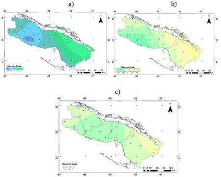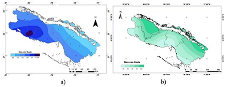 Aunque para el periodo lluvioso existe un promedio de 85 días con lluvia, existen zonas que pueden superar los 100 días, como ocurre en Tope de Collantes, con aproximadamente 114 días lluviosos como promedio. En las costas se presentan zonas con la menor cantidad de días con lluvia alcanzando apenas los 72 e incluso 64 días, como se aprecia en Nuevitas. Hay un fuerte contraste entre el este y el oeste del área de estudio, siendo mínimas hacia la costa norte de Camagüey, y mayores en las áreas montañosas al suroeste de la región, que comprende el sur de las provincias Cienfuegos, Sancti Spíritus y Ciego de Ávila (Figura 2 a).