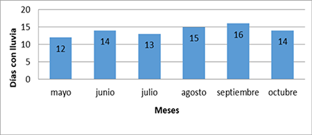 La cantidad de días con lluvia promedio en los meses del período lluvioso fueron máximos en septiembre y agosto, y mínimo en mayo.