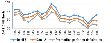 Promedio de días con lluvia en los decenios 1981- 1990, 1991- 2000, 2001-2010