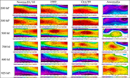 Para comprender mejor las causas del déficit de días con lluvia se analizaron las características de las alturas geopotenciales en diferentes superficies de presión y los perfiles verticales de la velocidad vertical de presión (Omega), debido a que estas variables son sensibles frente a situaciones meteorológicas específicas. El período 1994 resultó ser un período contradictorio ya que en ocasiones las variables e índices empleados no reflejaron un comportamiento homogéneo en el mismo, ni en cada uno de sus meses deficitarios en días con lluvia. Esto se profundizó en el análisis por decenas y se comprobó que existieron varios días que aportaron gran cantidad de lluvia, pero en el mes en general los días con lluvia fueron pocos. Por lo que este caso de estudio no se aborda, ya que amerita un análisis más profundo y específico.