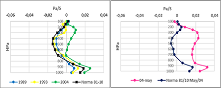 El movimiento vertical de las masas de aire en la troposfera se determina mediante la velocidad vertical de presión Omega , expresado en Pascal por segundo (Pa/s). Omega positiva indica movimientos de descenso, lo que representa condiciones que desfavorecen los procesos de la lluvia y Omega negativo, movimientos de ascenso que la favorecen (Centella et al., 2006; Cutié & Lapinel, 2013).