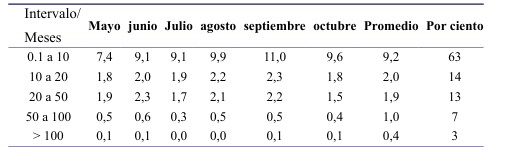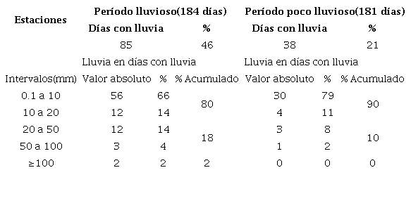 Se obtuvo el mayor por ciento promedios de días con lluvia en el intervalo de 0,1 a 10 mm, con un 63% aproximadamente. Los meses de agosto y septiembre están por encima de estos valores, mientras que mayo tiene el menor valor. Los intervalos de 10 a 20 mm y de 20 a 50 mm tienen menor porcentaje de días con lluvia con respecto al primer intervalo, con 14% y 13% respectivamente. En cuanto a los días con lluvia de 50 a 100 mm el por ciento es de 7%, pero los meses julio, agosto y octubre se mantienen por debajo de esta cifra. Sin embargo, para los días con lluvia >100 mm el promedio es 3%, aproximadamente, es decir que el 97% de días con lluvia promedio se encuentra en el rango de 0,1 a 100 mm. Esto indica que, a pesar de mayor cantidad de días con lluvia el acumulado de precipitaciones no es óptimo, es decir, mayor intensidad no coincide con mayor frecuencia (Tabla 3).