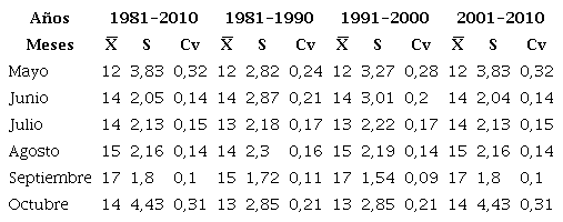 A través del cálculo de los valores medios de días con lluvia y el coeficiente de variación en el período 1981-2010 y también por decenios, se comprobó que la mayor variabilidad se presenta precisamente en los meses de tránsito estacional mayo y octubre, con valores correspondientes a 0.32 y 0.31, respectivamente. La menor variación pertenece a septiembre (0.1) y agosto (0.14). De manera general, el coeficiente fluctúa entre 0.10 a 0.32. En mayo y octubre, el coeficiente ha aumentado en el último decenio, a diferencia de junio, julio y agosto que ha disminuido (Tabla 4). Los días con lluvia de cada decenio en los diferentes meses, se mantienen constantes en mayo y en junio, el resto de los meses varían en el orden de un día con lluvia, principalmente aumentando en el tercer decenio, lo que puede estar indicando un aumento de días lluviosos hacia los últimos años. Estos resultados coinciden con los encontrados por Durán (2016) en el occidente del país.