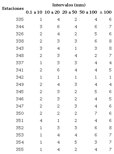 Fueron empleadas 19 estaciones meteorológicas del Instituto de Meteorología (INSMET), distribuidas en toda la región central, tanto en zonas interiores como cercanas a la costa, para obtener datos de días con lluvia de alta calidad desde 1981 hasta el 2010, proporcionados por el Centro Nacional del Clima (CENCLIM) a partir de los acumulados diarios de lluvia en 24 horas, clasificados por intervalos (Figura 1). Se escogieron cinco intervalos (0.1 a 10 mm, 10 a 20 mm, 20 a 50 mm, 50 a 100 mm y ≥ 100 mm) a partir de los registros de las Tablas de asentamiento de las Observaciones Meteorológicas del CENCLIM y por referencia de otros trabajos relacionados con esta variable.