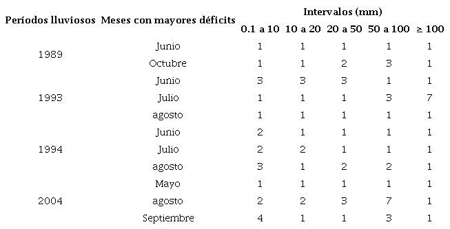 Para identificar los períodos más afectados o casos de estudio , se tomaron en cuenta los que presentaron mayores días deficitarios en cada estación y los períodos lluviosos de mayor frecuencia de afectación simultánea entre todas las estaciones meteorológicas, correspondientes a los años 1989, 1993, 1994 y 2004. En los mismos, las zonas con déficit de días con lluvia se mostraron comunes, tanto en los períodos mayo-octubre, como en los meses más afectados. En los meses de los períodos lluviosos más deficitarios los días con lluvia por intervalos indican que todos son influenciados por los procesos de sequía significativos, los déficits en la cantidad de días con lluvia no dejan de manifestarse en cualquier intervalo. Por tanto, se deduce que la carencia de días con lluvia en los intervalos superiores no son los que únicamente contribuyen a estos procesos (Tabla 6).