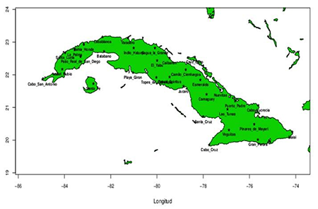También se empleó una base de datos que contiene la lista de estaciones meteorológicas y su localización geográfica. La figura 1 muestra el mapa de Cuba con la localización y el nombre de las 32 estaciones, las cuales fueron seleccionadas de acuerdo con diferentes criterios, tales como: tamaño de la serie, registro del mayor valor de viento máximo, ubicación geográfica y fenómenos que han afectado a la localidad donde se encuentran instaladas, principalmente si fueron afectadas por huracanes en las décadas más recientes. Estos criterios tratan de garantizar la representatividad de dichas estaciones en cada provincia y región, por lo que engloban un comportamiento general y confiable de dicha variable. (Proyecto: Caracterización físico-meteorológica de las capas bajas de la atmósfera a partir de la implementación de una red de torres altas de gradiente y su aplicación al estudio del viento como fuente de energía).