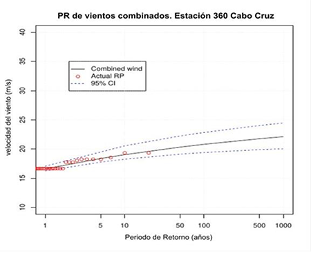Para ilustrar este tema se presenta en la figura 10 la curva de PR de vientos combinados con el IC para una probabilidad del 95%, es decir se calculó el intervalo en que debe encontrarse la curva de PR en un 95% de los casos. Los círculos rojos muestran el PR calculado directamente de las observaciones (por esto los círculos cubren solo 20 años). Las curvas de rayas azules muestran el IC al 95%, el cual es un intervalo no simétrico como corresponde a cálculos con viento. Es interesante observar como el modelo que se empleó (curva de DGP, color negro) se ajusta perfectamente a los círculos rojos. En archivo aparte se presentan las curvas de PR de los vientos combinados con el correspondiente IC, véase el Anexo.