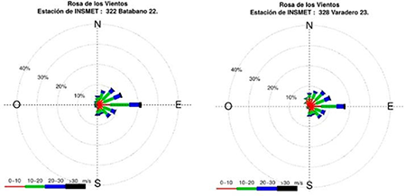 Para estudios de peligro, vulnerabilidad y riesgo es importante también mostrar la dirección del viento. En este trabajo se calculó la rosa de los vientos para cada estación usando un intervalo de 22.5 grados, es decir, una rosa de los vientos de 16 direcciones. Se presentan los resultados para 2 estaciones en la figura 11, y para las restantes se presentan en archivo aparte como se explica en el anexo.