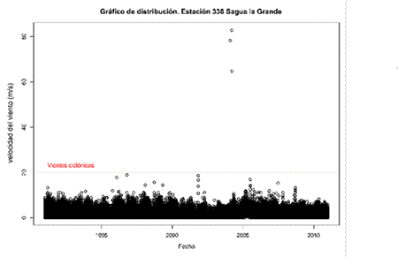 Como un ejemplo del procedimiento, en el gráfico de distribución de Sagua La Grande (Figura 2) extraído del Archivo # 1, que cubre un periodo de 20 años (desde 1990), se puede apreciar que la mayoría de las velocidades del viento están por debajo de 20 m/s (línea roja) excepto unas velocidades altas correspondientes al paso del huracán “Jeanne” cerca de la estación en septiembre del 2004 (Tabla 1). La máxima de estas velocidades es de 82 m/s. Nótese que solo hay 3 registros con velocidades superiores a 20 m/s. Estas velocidades distorsionan completamente la base de datos y hace imposible ajustar una distribución de valores extremos, esto es lo que se denomina “outliers” en estadística o valores “aberrantes”. Para calcular el PR usando una distribución de valores extremos es necesario primero remover estos valores aberrantes para así obtener una base de datos homogénea.