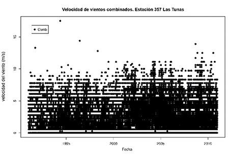 Una vez que se han separado los vientos sinópticos de los producidos por tormentas se obtienen 3 bases de datos: la base original denominada “vientos combinados” puesto que contiene los vientos sinópticos y de tormentas y que en este trabajo denominamos “comb”. La segunda base de datos se denomina “thund” y contiene los vientos producidos por tormentas y la última base de datos contiene los vientos sinópticos y se denomina “synop”.