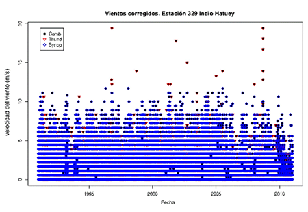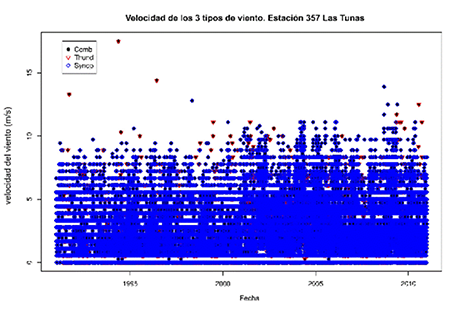 En la figura 3B se puede apreciar que hay un valor máximo de viento de 17.5 m/s en las observaciones originales (comb, color negro, cerca de 1995). Los siguientes 2 valores más altos correspondientes a 13.9 y 13.3 m/s son también clasificados como “thund” pero los siguientes 2 valores más altos (en 1998 y 2009) son clasificados como “synop”, esta distribución de los valores más altos en la base de datos es correcta. La mayoría de los valores corresponden a vientos de tipo sinóptico (rombos azules) y hay muy pocos valores rojos puesto que las tormentas no ocurren muy frecuentemente.