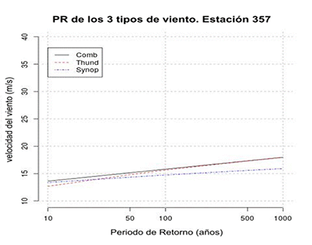 Como se puede apreciar en la figura 4A, la base de datos “comb” produce la curva más alta, esperándose una velocidad de 16 m/s cada 100 años, seguida de la curva de “thund” (roja) que presenta una velocidad próxima a la anterior. La curva roja tiene bajas velocidades para bajos PR (pocos años) y velocidades mucho más altas para PR altos. Para este tipo de PR la curva tiende a igualarse a la curva de “comb”. Este es una interesante característica de la curva “thund” y es debido a que hay pocos registros de este tipo de vientos en la base de datos, pero los mismos corresponden a valores altos. La última curva, de color azul, corresponde a los PR de vientos sinópticos, donde la velocidad correspondiente a un PR de 100 años es próxima a 15 m/s. Para valores bajos de PR (pocos años) las curvas de “thund” y “synop” son prácticamente iguales, pero para altos la curva de “thund” es mucho más alta debido a que los vientos sinópticos no tienen velocidades altas como los de tormentas. Esta ubicación relativa de las curvas de PR es la esperada cuando se separan correctamente los vientos de tormentas y vientos sinópticos (Holmes & Moriarty, 1999).