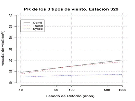 La amenaza producida por estos vientos se cuantifica calculando la magnitud y frecuencia con que se repiten los valores extremos. Para esto se utiliza el concepto de Intervalo Promedio de Recurrencia más comúnmente conocido como Periodo de Retorno (PR). El PR es particularmente importante para evaluar la tendencia a largo plazo de los valores extremos, que son los valores de importancia en el estudio del peligro producido por viento.