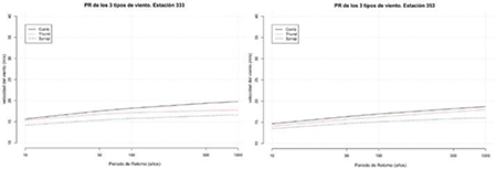 En la figura 8 se presentan 2 gráficos de distribución de velocidades de viento corregidas para poder calcular las curvas de PR. Estas velocidades de viento fueron registradas en las estaciones de Nuevitas (353) y Playa Girón (333).