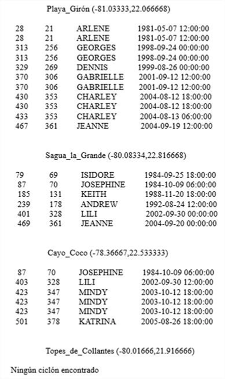El primer tipo de viento que se determinó es el viento producido por huracanes o ciclones tropicales. Este tipo de viento se distingue por tener velocidades muy altas, generalmente de corta duración, que ocurren con poca frecuencia. Para localizar estos valores se analizaron los gráficos de la distribución cronológica del viento (“scatterplot”), los cuales se muestran en el Archivo # 1 para cada una de las estaciones de registro (Véase el Anexo). Como puede apreciarse, en algunos de estos gráficos se encuentran valores muy altos que sobresalen del resto, los cuales son los valores típicos de vientos ciclónicos. Para comprobar que estos valores fueron producidos por ciclones tropicales se confeccionó una lista de todos los ciclones que pasaron a menos de 50 km de las estaciones y la fecha correspondiente, seleccionando de esta forma los valores de vientos ciclónicos para cada una de las estaciones. Los resultados para 4 estaciones se presentan en la Tabla 1, mientras que el archivo completo se presenta en Archivo # 2 como se explica en el anexo. Nótese que en la estación Topes de Collantes no se encontró ningún huracán que cumpliera estas condiciones. Las 2 primeras columnas son el número de identificación del WMO.