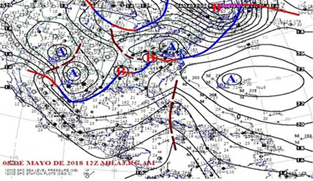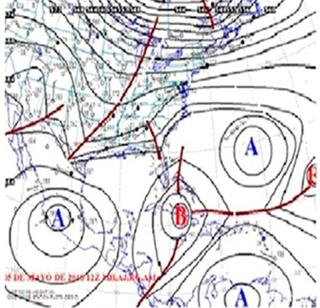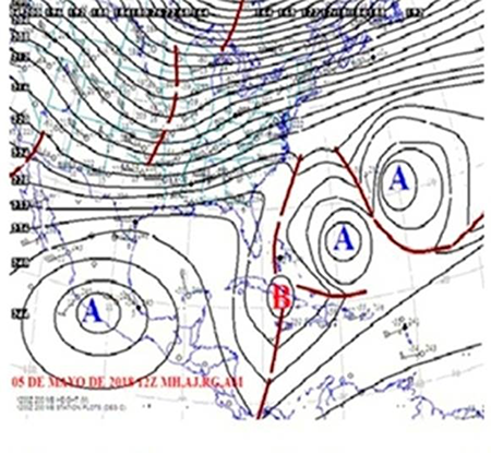 La hondonada en superficie es el reflejo de la baja fría superior (figuras 2 y 3). La baja fría tiene su centro ubicado sobre las provincias del oriente cubano, pero la circulación de la misma influye sobre el territorio nacional y mares adyacentes.