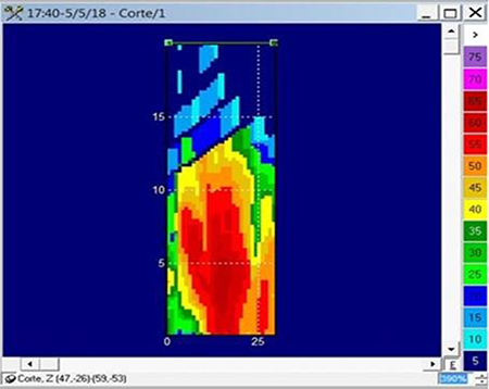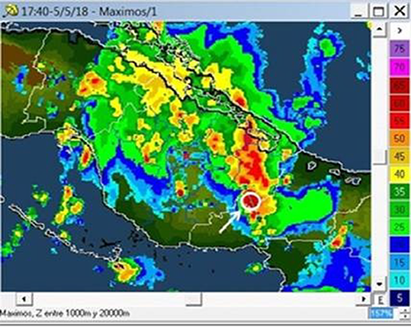 La figura 10 muestra la nubosidad sobre el municipio de Guáimaro a las 17:40 hora local con la máxima reflectividad de 66 dBz y un tope de 18 km de altura, que estuvo generada por mecanismos de formación continua de celdas de gran desarrollo. Estas imágenes se realizaron con el radar de Camaguey.