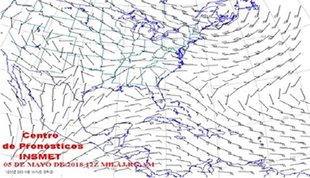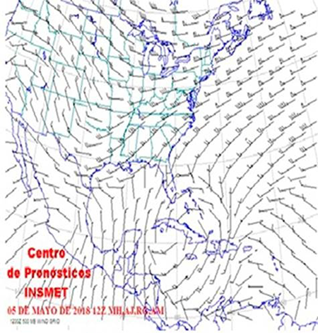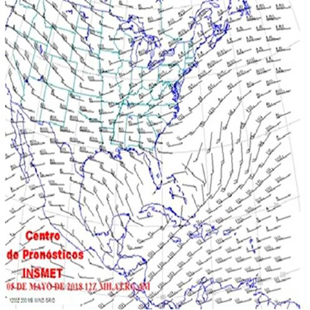 En el nivel de los 500 hPa se muestra sobre Camagüey un flujo de viento del SW (figura 5).Se puede observar la circulación de la dirección del viento en sentido contrario a las manecillas del reloj sobre todo el territorio nacional. En la figura 6 se muestra en el nivel de 200 hPa sobre Camagüey un flujo de viento de componente SW.