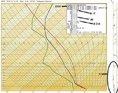 Otra herramienta que no se debe obviar para el desempeño correcto en la vigilancia meteorológica, es el empleo de la carta seudoadiabatica que permite mostrar en muchas ocasiones factores determinantes para el diagnóstico de severidad y que debe tratarse como un conjunto de factores en cada análisis, o sea, es necesario la interpretación desde la estructura reflejada en el diagrama de temperatura, punto de rocío, dirección y velocidades predominantes en los niveles de 850, 700, 600 y 500 hPa, con los índices de estabilidad calculados, principalmente en los índices del CAPE(energía disponible), LI (índice de levantamiento), TT (total totales ) que determina el gradiente térmico en la capa 850 a 500 hPa y la humedad del nivel de 850 hPa y la temperatura en 500 hPa (Tc), viento medio en la capa de 0-6 km y el índice SWEAT para evaluar tiempo severo.