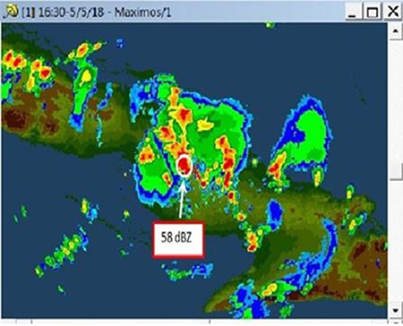 En la imagen del radar de Camagüey a las 16.30 hora local se observan núcleos fuertes al suroeste (figura 8), esta actividad convectiva con reflectividad máxima de 58 dBZ y tope máximo de 12 km afectó a la ciudad con fuertes vientos y caída de granizos.