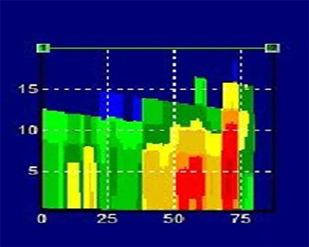 La figura siguiente muestra el corte vertical que se le realizó al eco convectivo muy fuerte ocurrido en Guáimaro a las 17:40 hora local. Se observa reflectividad de muy fuerte a severa en los primeros Km de altura.