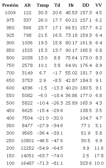 En la tabla 1 se muestra un resumen del sondeo aerológico donde se aprecia un flujo cálido y húmedo en niveles próximo a superficie hasta los 700 hPa, con vientos del sureste (SE) y sur (S). Sin embargo es de considerar cuán profundo se presenta la masa cálida y húmeda en estos casos, donde se muestra marcadamente hasta los 500 hPa y luego toma una inclinación hacia el ESE para luego representarse los ENE desde 400 hasta los 150 hPa, haciéndose profunda en la altura y teniendo una marcada correspondencia con las temperaturas de 500 y 300 hPa que permiten definir la influencia de la baja fría en la altura. En los niveles hasta 450 hPa están secos y solo se observan que están húmedos entre 900 y 800 hPa