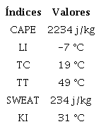 En la tabla 2 se muestran los valores de los índices que sirven de base en el análisis. El valor del CAPE es considerado moderado. El LI refleja una marcada inestabilidad considerando que la temperatura en 500 hPa es extremadamente fría (-10,4 ºC). El total cruzado (TC) es significativo para ocurrencia de tormentas a partir de valores de 19°C. Según Miller (1972), el TT con valores a partir de 49°C son favorables para ocurrencia de TLS, en tal sentido se hace evidente la combinación de un gradiente sumamente cálido y húmedo entre los niveles de 500 y 850 hPa. Los valores altos de este índice son muy característicos en los fenómenos severos, aunque se pueden encontrar casos en que se presentan inferiores al mismo.