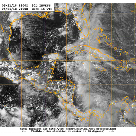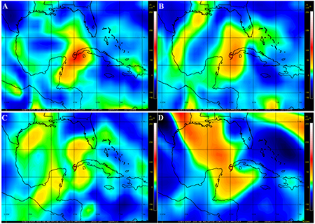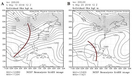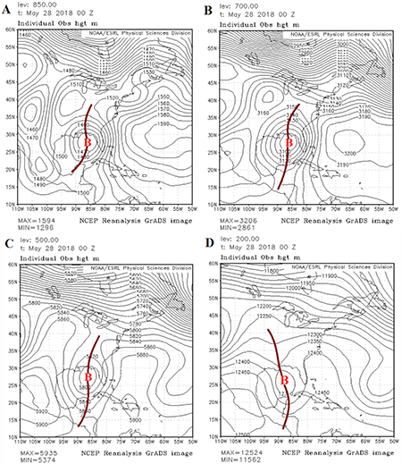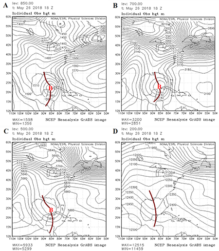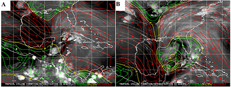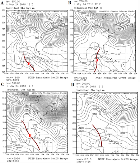 A partir del análisis de los mapas sinópticos de geopotencial se pudo comprobar la existencia de una vaguada superior desde el día 10 de mayo sobre el noroeste del golfo de México. Este sistema se encontraba extendido desde los Grandes Lagos (EE. UU) hasta la región central de México (figura 1A). La onda larga asociada a la misma se volvió más inestable a medida que se desplazó hacia el este, de tal forma que se fracturó la vaguada y posteriormente se originó una baja superior sobre el sur de Alabama. A partir del día 13, tanto la baja como la vaguada superior experimentaron continuos procesos que produjeron importantes cambios en su estructura, representación e intensidad, sin embargo, su posición no varió significativamente. La vaguada superior se mantuvo oscilando entre el este del golfo de México y la península de Yucatán hasta el oeste de Cuba y el Caribe occidental, con eje orientado fundamentalmente de noroeste a sudeste como muestra la figura 1B. La difluencia superior generada por este sistema favoreció los movimientos verticales ascendentes en la tropósfera baja, incentivando el desarrollo de la convección. Estas condiciones propiciaron la formación sobre el golfo de Honduras de una vaguada en superficie desde el día 18 y de un amplio centro de bajas presiones a partir del 20.