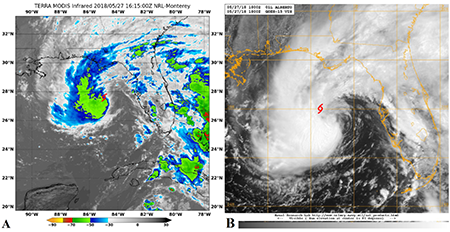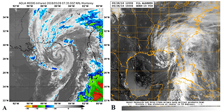 Posteriormente, la TS se desplazó hacia una región de más débil cizalladura vertical del viento y, adicionalmente, la persistencia de la convección organizada fue debilitando la intensidad de esta. Consecuentemente y, favoreciendo este mecanismo, se produjo el desarrollo de la nubosidad más cerca de su centro. El proceso anteriormente descrito estuvo estrechamente relacionado con la transición tropical de Alberto, siendo, junto con la presencia de elevados valores de TSM, cuestiones claves para la misma. Como resultado, horas previas a su clasificación como TT, este organismo comenzaba a presentar convección organizada alrededor de su centro (figura 12A). Al punto de ser clasificado como tal, la convección prácticamente se encontraba rodeando al centro (figura 12B). Luego de esta transición, la nubosidad asociada con la TT Alberto se comenzó a separar de la banda de nublados en capas incentivada por la vaguada superior, como muestra la figura 13A y B.