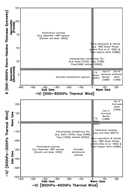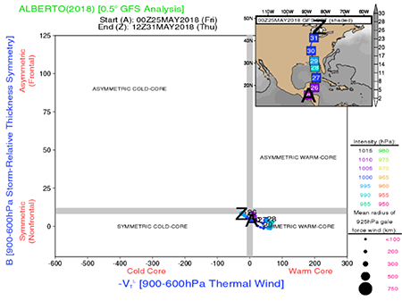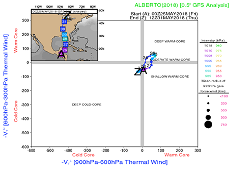 En la figura 15 también se puede apreciar la posterior evolución del sistema. La estructura térmica de su núcleo fue cambiando de manera gradual, de tal forma que se asemejaba significativamente a la que presentan los CT. Es así que desde el 27 de mayo a las 1200 UTC Alberto había adquirido un núcleo cálido hasta los niveles medios; posteriormente este se profundizó en toda la columna troposférica. La liberación de calor latente de condensación generada por la convección profunda alrededor de su centro, en combinación con el debilitamiento de la cizalladura vertical del viento, favorecieron este proceso. La figura 16 muestra, a manera de ejemplo, la posición más representativa o única de cada tipo de ciclón para los dos diagramas utilizados.