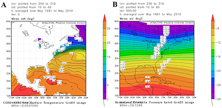 Se extrajeron además, los mapas medios de la TSM y de la temperatura del aire en los 500 hPa para el mes de mayo, del período comprendido entre 1981 a 2010, en sitio web https://www.esrl.noaa.gov/psd/data/gridded/data.ncep.reanalysis.html. De esta forma se pudo comparar los valores medios de estas dos variables con respecto a los que se presentaron durante la génesis y desarrollo de la TS Alberto.