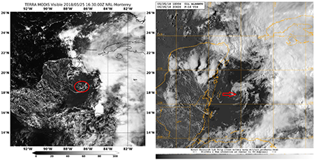 En las imágenes de satélite del día 25 se pueden distinguir fácilmente las características y patrones asociados con los CS, según Herbert & Poteat (1975). En la figura 9 se observa el centro de circulación del sistema expuesto, definido por un vórtice de nublados bajos de poco a moderado desarrollo vertical. Estas particularidades son comunes para organismos ciclónicos que se encuentran bajo un ambiente de moderada a fuerte cizalladura vertical del viento. Los nublados en capas y convectivos se sitúan hacia el norte y al este del centro, además tiene una extensión de alrededor de 15°, como se aprecia en la figura 10A y B. Estos autores también argumentan que es común que los CS permanezcan conectados a otros sistemas, en este caso, Alberto se encontraba conectado a una banda de nublados en capas y convectivos que previamente existía sobre Cuba y el Caribe occidental, como muestra la figura 11.
